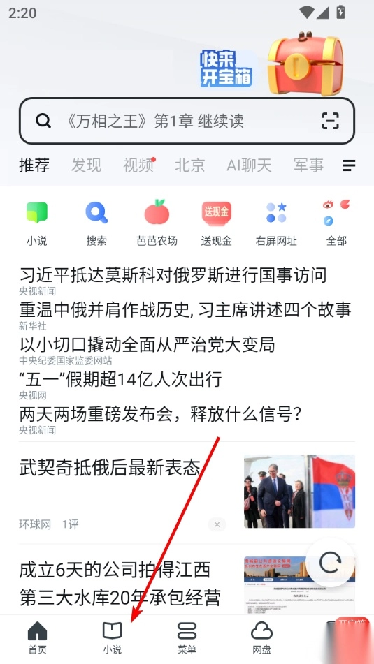 打开UC浏览器极速版,点击导航栏里的小说选项,进入小说栏目页面。