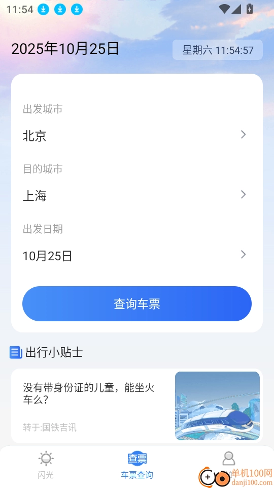 这款软件能够让用户一键查询所需的火车票,只需输入出发地与目的地城市,系统便会智能搜索车次及对应的票源情况。