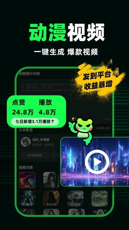 AI视频蛙是一款智能视频创作工具,多种智能创作模式,支持图生视频、文生视频、动漫视频等功能,能满足多样化的视频创作需求。它为自媒体用户提供了更便捷的创作体验,助力打造爆款视频,轻松提升视频热度。借助AI视频蛙,创作者可以释放更多想象力,将天马行空的想法快速转化为视频内容,创作出不同类型的优质作品。需要的用户不妨尝试使用,让视频创作更高效、更出彩!
