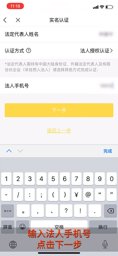 输入法人手机号点击下一步。