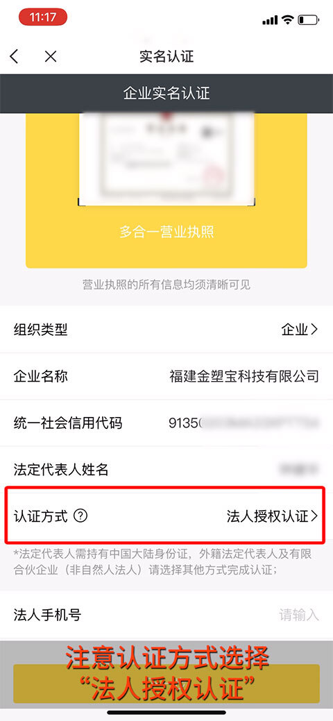 注意认证方式选择“法人授权认证”。