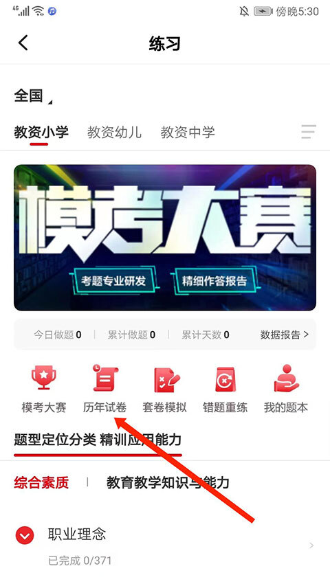 进入练习界面后,向下滑动页面,即可看到“模考大赛”“历年试卷”“套卷模拟”“错题重练”“我的题本”等多种刷题类型,接下来我们以“历年试卷”为例进行说明。