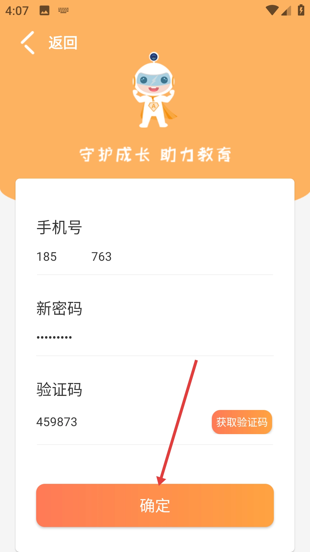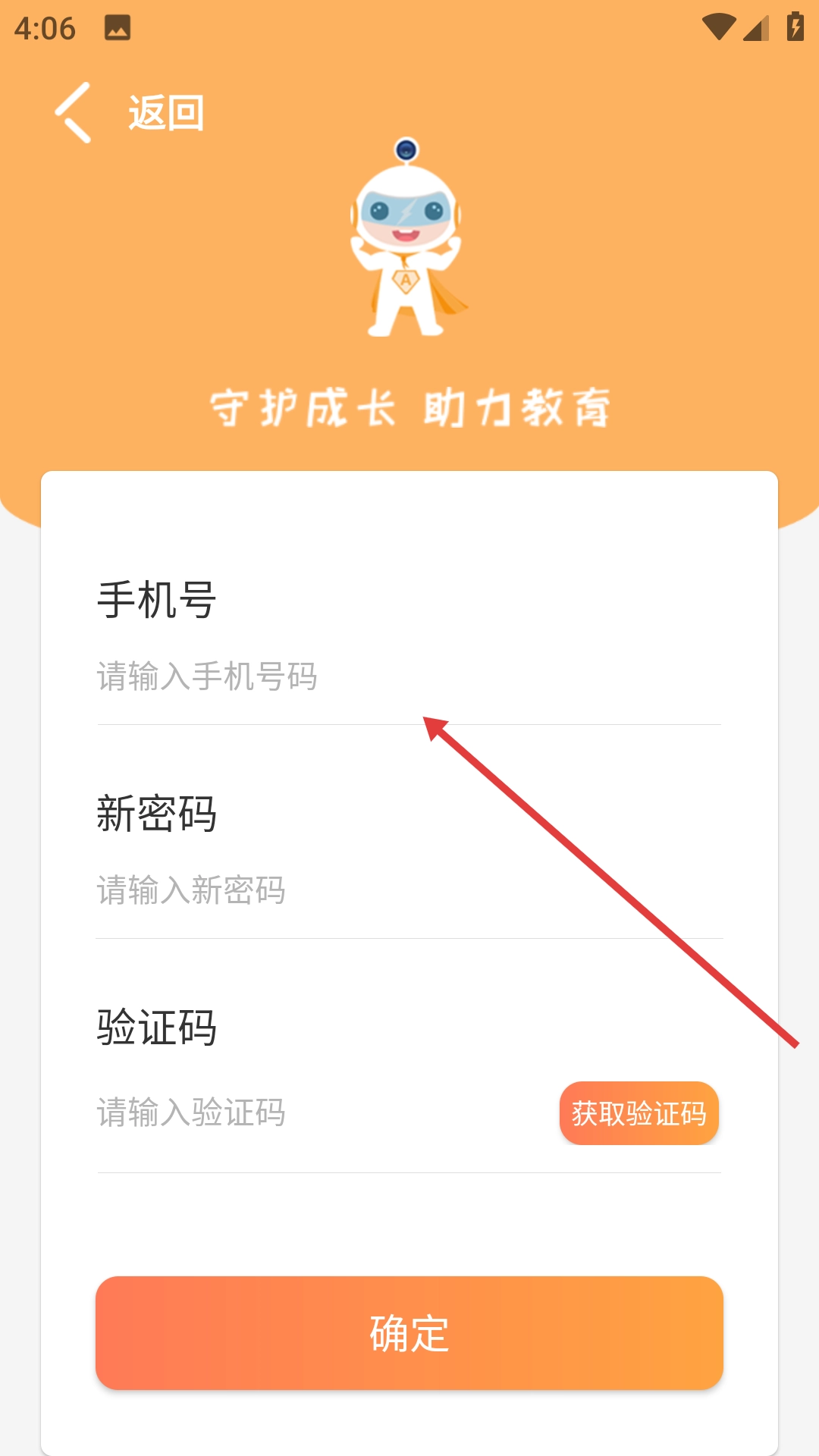 在密码重置页面输入手机号、新密码。