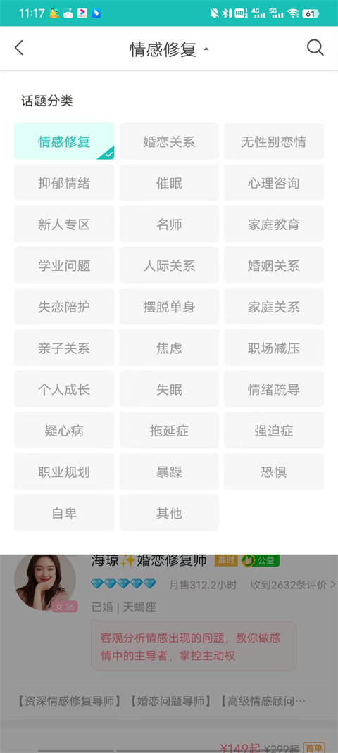 进入软件首页,选择你想要的咨询类型,如情感咨询;