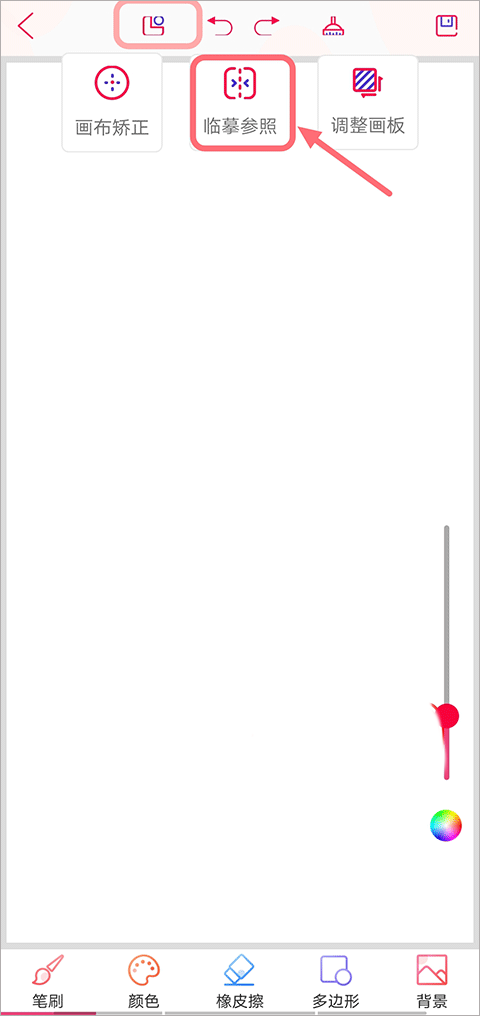 进入画板界面后,点击顶部的“参照”图标,接着选择“临摹参照”选项。