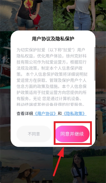 安装并打开挝爱应用,在用户协议与隐私保护提示的界面上,点击“同意并继续”按钮。