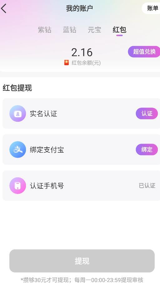 点击红包入口就能申请提现,不过需要满足30元的额度要求才行!