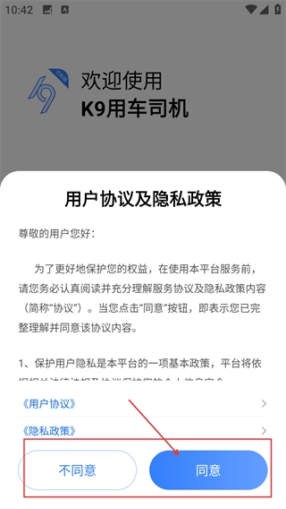 打开【K9用车司机】应用后,页面会弹出【用户协议及隐私政策】的提示窗口。请您仔细阅读相关内容,阅读完毕后点击【同意】按钮,就能继续进行后续的操作步骤了。