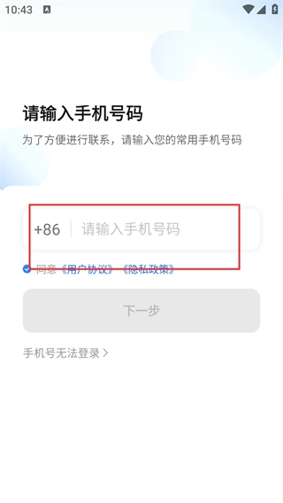 在【请输入手机号码】页面,需要在【+86】后面的输入框中填写你常用的手机号码,并且勾选相关协议后,【下一步】按钮才会被激活。