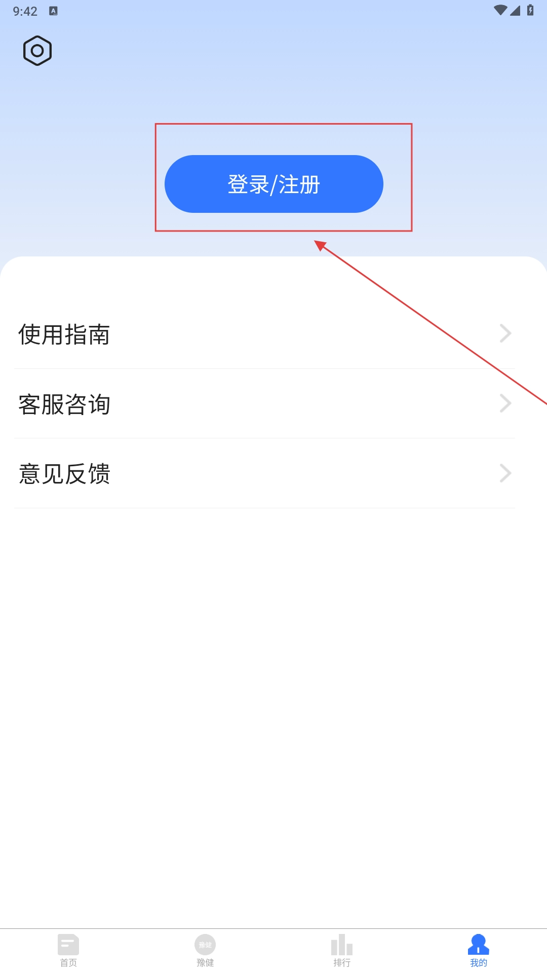 进入“我的”页面后,点击【登录/注册】功能按钮,即可进入登录注册界面。