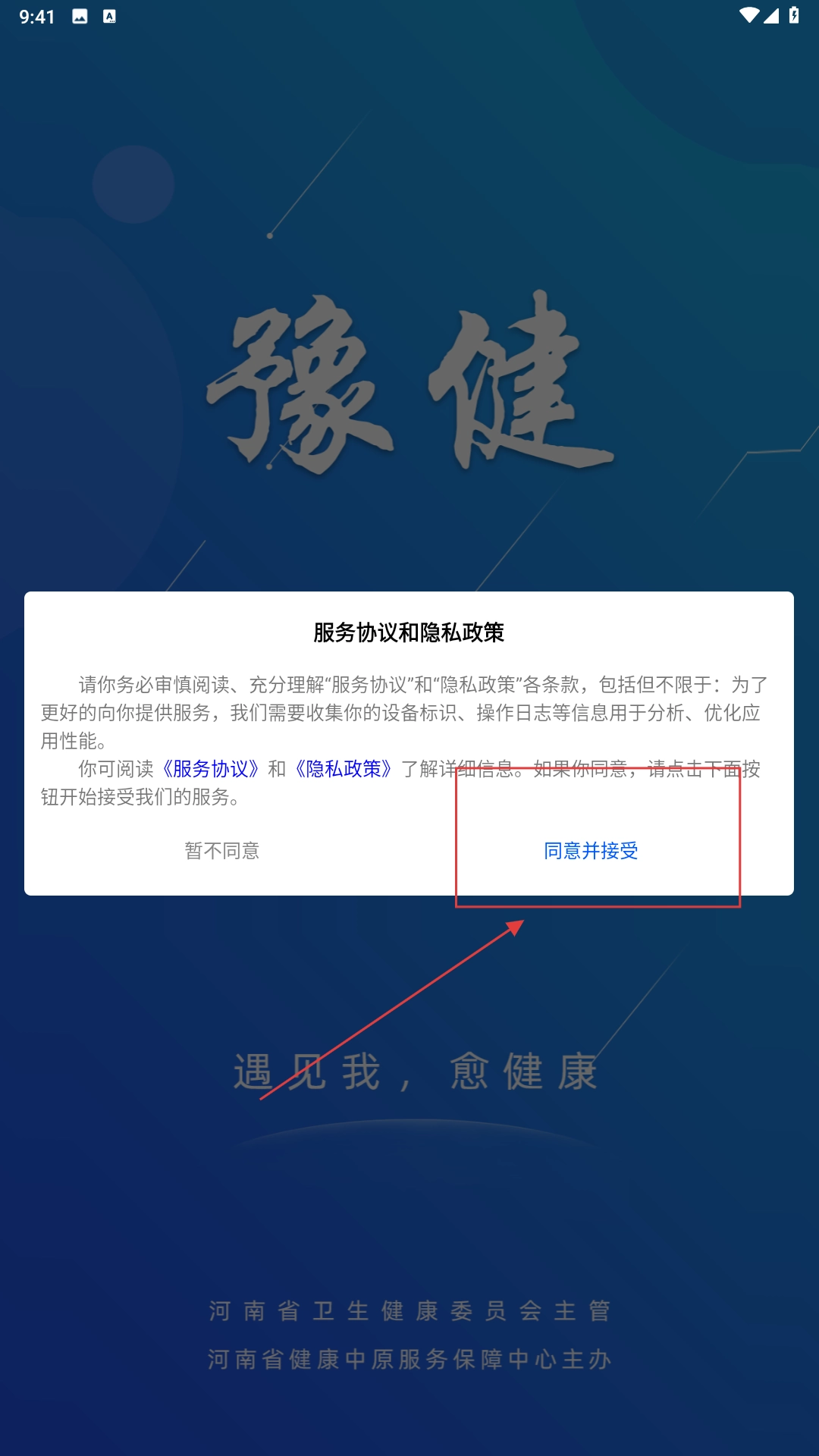 在服务协议页面,点击【同意并接受】功能按钮,以确认接受相关协议与政策。