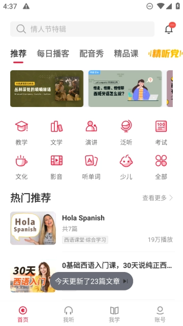 每日西语听力最新版是一款专为西班牙语爱好者打造的手机应用。该软件内所有功能用户都能免费使用,每日还会更新最新西班牙语资源,并且支持无限离线使用。它除了提供海量的西语原文外刊名著等你来发现,还支持变速播放,各类循环模式一应俱全,快来体验一下吧。