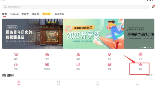 打开后先找到“全部”选项,选择符合自身水平的学习阶段,然后进入听力库,挑选感兴趣的主题素材开始练习。