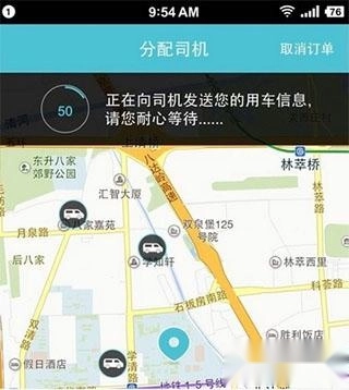 确认订单后,系统会负责分配司机,此时的等车界面和滴滴打车的界面几乎一模一样,在等待司机的过程中,用户可以选择取消订单。