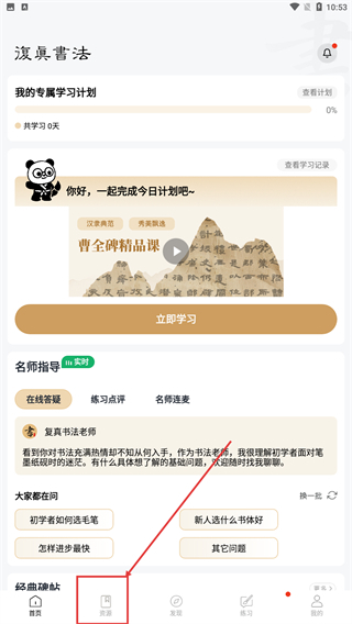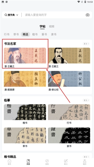 在复真书法的首页,点击页面底部的【资源】选项,就能进入书法资源相关的内容页面,在那里可以查看字帖、视频等各类素材。