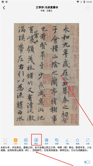 在作品详情页,点击【释文】按钮,就能看到该书法作品对应的文字释读内容,以此帮助理解作品内容。