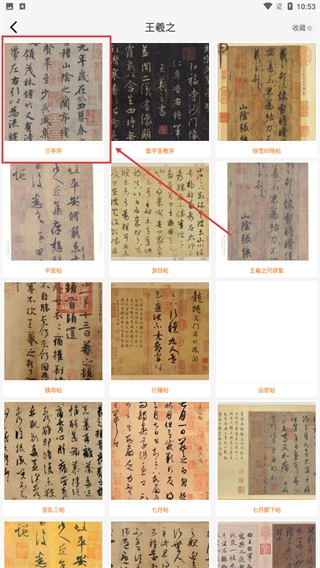 在王羲之的作品列表里,挑选你想查看的目标作品(例如【兰亭序】),然后进入该作品的详情页面进行查看。