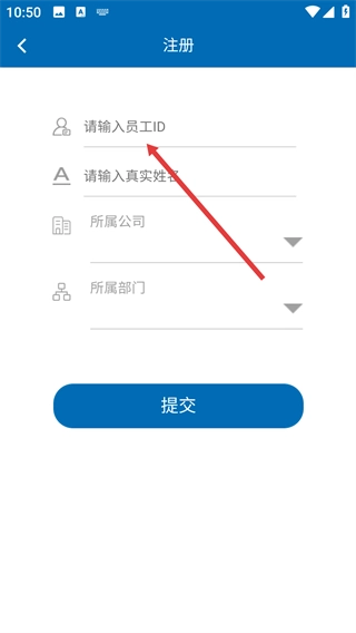 在注册页面,按顺序填写【员工ID】【真实姓名】,再选择【所属公司】【所属部门】,即可完成信息录入。