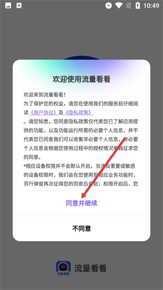 首次打开【流量看看】应用时,需要阅读《用户协议》和《隐私政策》,点击【同意并继续】按钮后,即可进入应用的主界面。