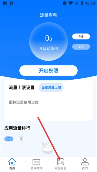 在应用的首页,你能够查看流量的使用情况,点击页面底部的【观星看看】按钮,就能进入到与观星相关的内容板块。