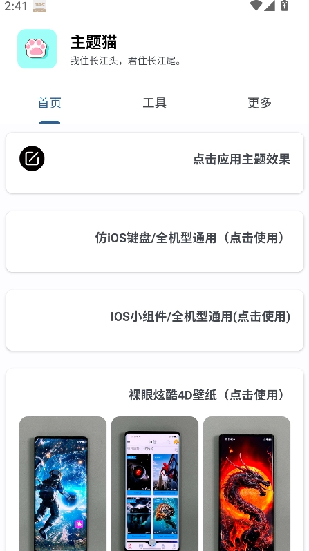 《主题猫》是一款集设备主题美化与实用工具于一体的软件。它支持应用主题效果,包括全机型通用的仿iOS键盘、适配各类设备的iOS小组件,还能通过裸眼炫酷4D壁纸增添视觉层次感。进入工具页面,用户可体验iOS灵动岛功能,也能启用iOS备忘录和iOS随手记,既满足了主题美化的需求,又覆盖了日常工具使用场景,让设备的个性化设置更丰富,实用功能体验更完善。