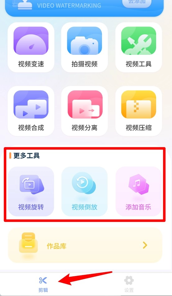 在主界面点击更多工具,就能展开视频旋转、倒放、添加音乐等额外编辑功能模块,供用户挑选使用。