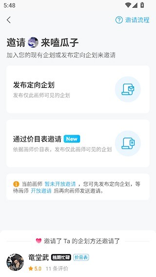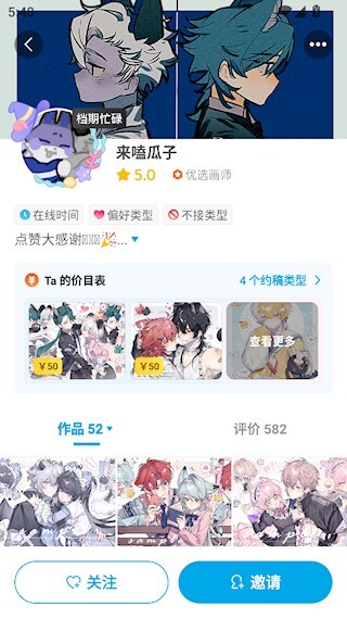 进入画师详情页后点击邀请