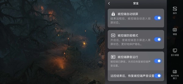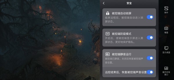 连接远程控制设备后,找到侧边工具栏,依次点击“操作”选项和“安全”选项,在其中找到“被控端防窥模式”功能,点击即可开启或关闭该功能。