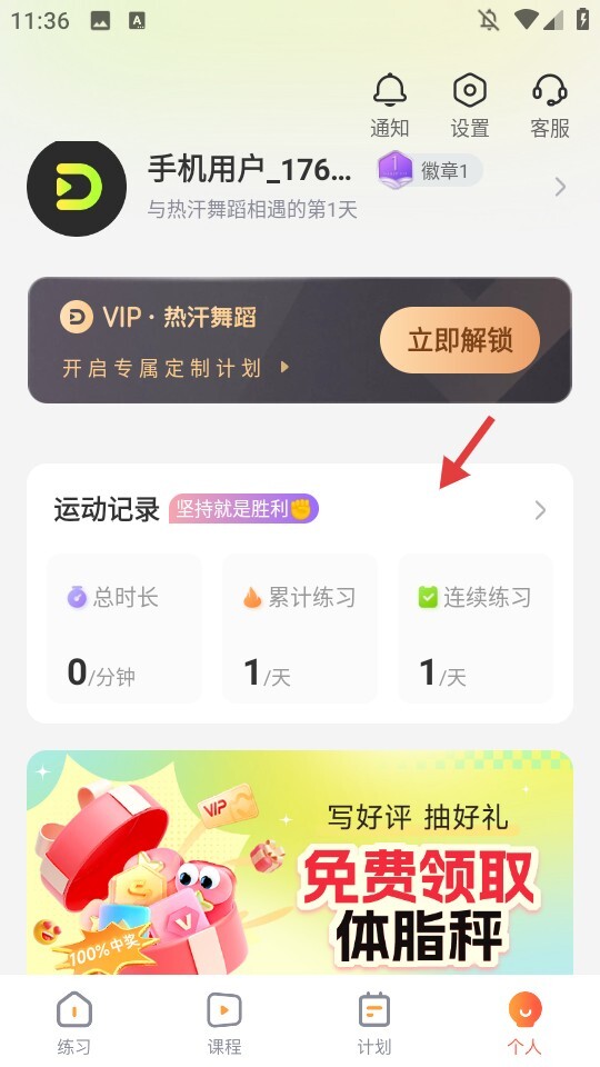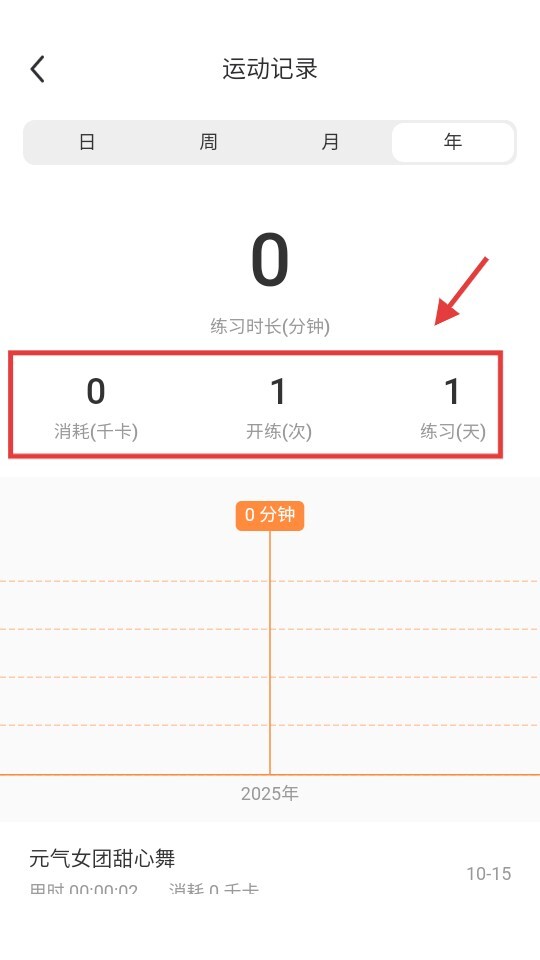 在运动记录页面能够查看消耗千卡数、开练次数、练习天数等运动相关数据。