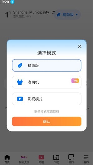 弹出窗口会呈现三种模式:老司机模式、影视模式和精简模式。