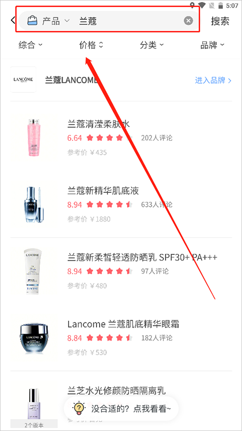 搜索完成后,相关商品的列表信息就会呈现出来。点击对应的产品,就能进入产品详情页面,在这个页面里找到成分分析的栏目即可。