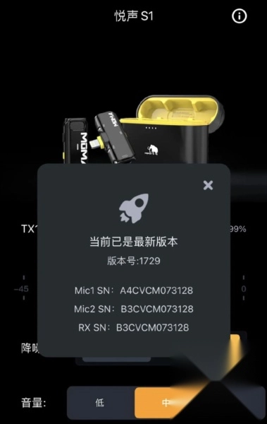 可快速完成猛犸麦克风硬件的配对操作,能对电量进行实时监测,并且支持固件升级功能。