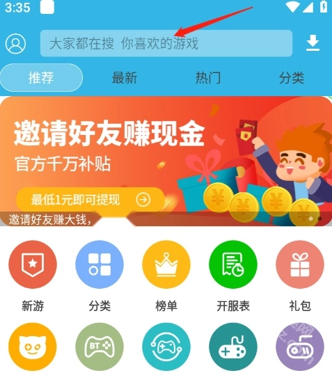 在游戏界面顶部的搜索框里输入你想找的应用软件或者游戏的名字