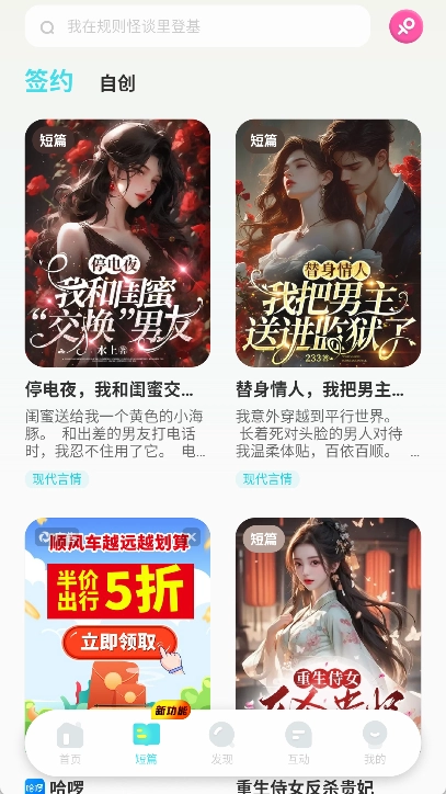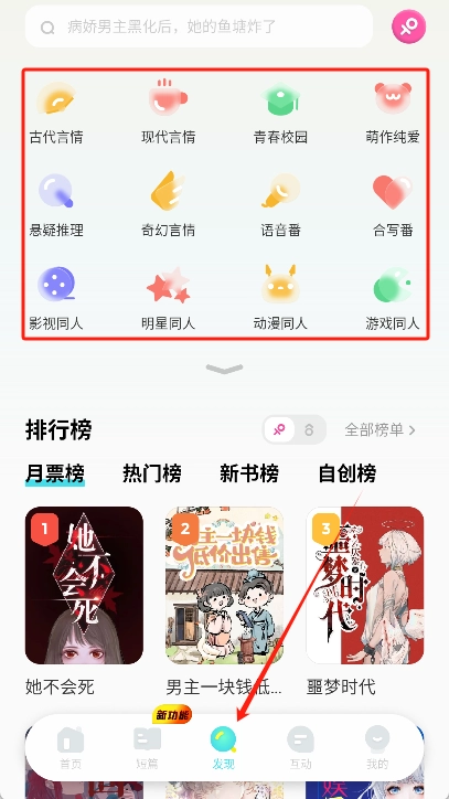 你可以点击页面底部的【发现】按钮,然后从中挑选出你感兴趣的小说分类以及具体的小说作品。