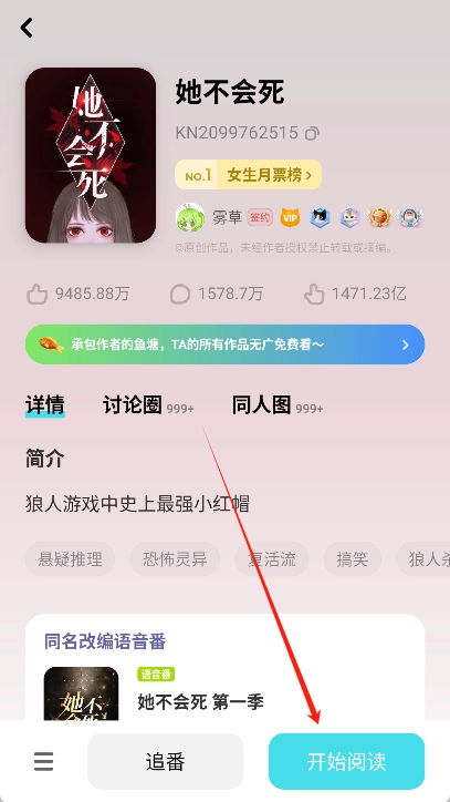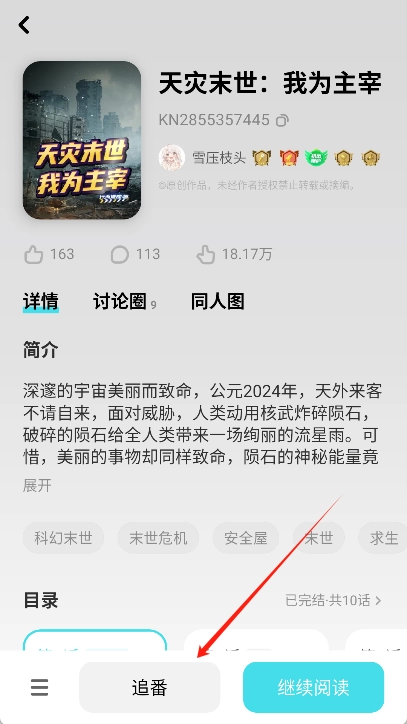 进入小说详情页面后,点击【追番】按钮完成追番设置,这样就能在首页的“我的追番”板块中及时查看更新内容了。