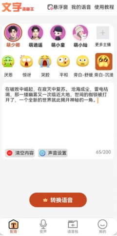 文字语音王是一款功能强大的文字转语音软件,借助先进的语音合成技术,可快速将输入的文本转化为自然流畅的语音输出。它适用于学习、工作、娱乐等多种场景,为用户提供便捷的语音服务,支持中文、英文等多种语言,还配备了丰富的语音包供用户挑选。