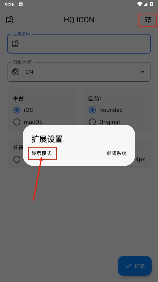 然后点击右上角的图标进入扩展设置,再点击“显示模式”选项。
