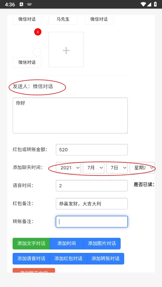 下滑还能添加对话人、对话文字、时间、红包等内容。