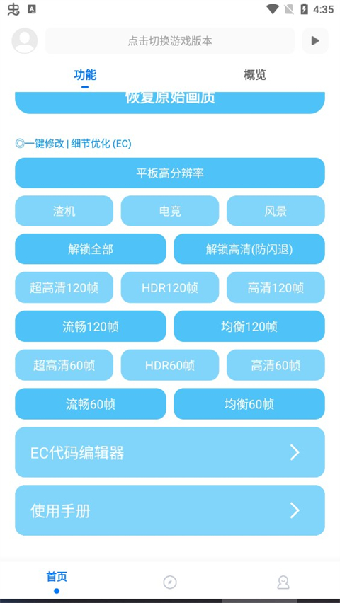 殇痕画质助手是一款用于调整游戏画质的应用工具,用户既能对画质参数进行自定义配置,也能随时恢复游戏原始画质状态。无论是追求细腻的视觉效果还是流畅的运行体验,都可以按照个人喜好自由设定各项参数。用户可根据自身设备性能和游戏需求,从帧率、画面清晰度等多个维度进行针对性优化,该工具支持60帧、120帧等多种帧率档位,且每个帧率选项都能搭配不同的清晰度设置方案,满足多样化的画质调整需求。