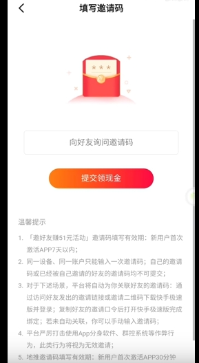 填写朋友的邀请码,点击提交领现金即可领取收益。