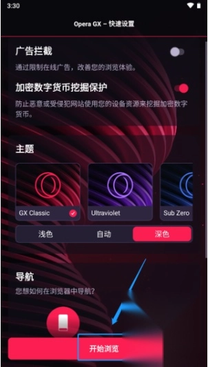 为保护用户视力,Opera GX浏览器配备了夜间模式功能。用户在夜间浏览时,既可以选择光明模式,也能切换到黑暗模式,并且可根据自身需求在两种模式间灵活转换。