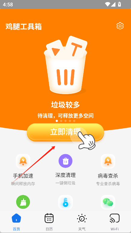 进入首页后,点击页面中间的“立即清理”按钮,就能一键完成手机垃圾文件的清理操作。