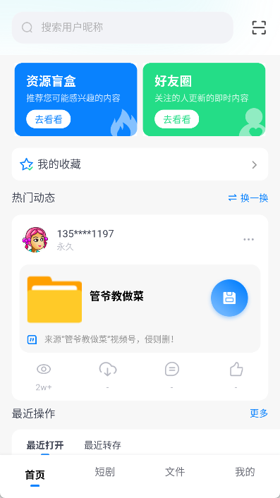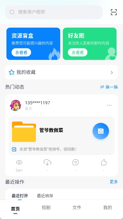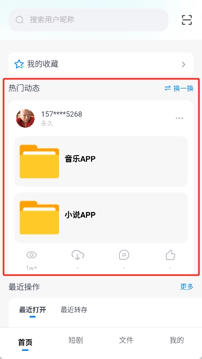 用户可借助网盘首页的“热门动态”板块,探索并获取其他用户分享的各类资源,以此实现资源发现。