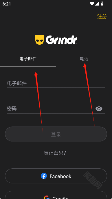 首次使用Grindr的用户,可点击右上角的“注册”按钮来创建新账号。