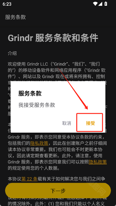 进入注册界面后,在跳转的页面里点击“下一步”,然后选择“接受”相关条款。