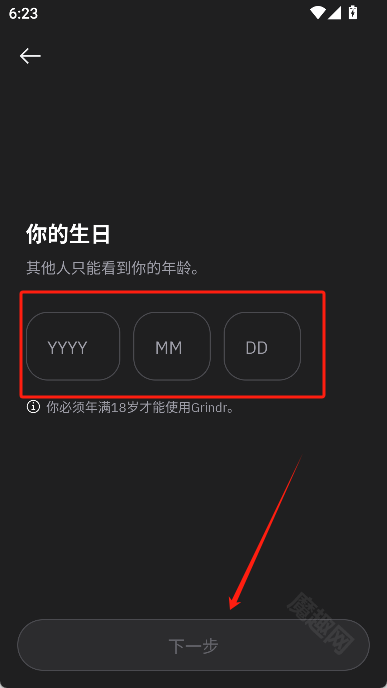 请于下一页填写您的出生年月日,随后点击“下一步”按钮。