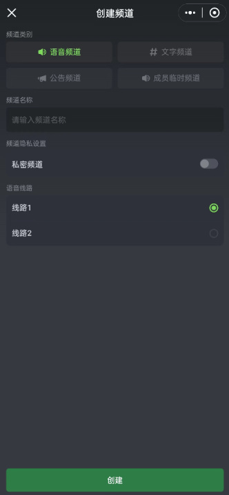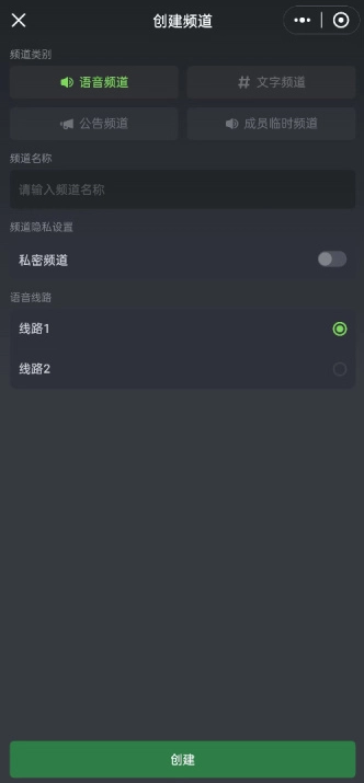 在房间管理功能里可以创建语音频道(目前暂不支持文字、公告及临时频道类型),创建后能够对频道名称进行修改,也可以将其设置为私密频道并选择语音线路;后续还能进入频道设置界面,把语音频道的默认音质调整为192kbps的高质量立体音。