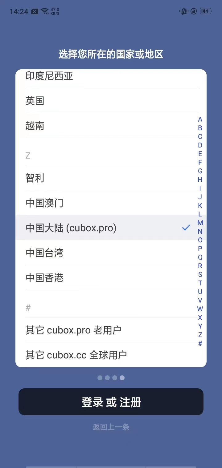 打开Cubox手机应用后,选择你所在的地区。