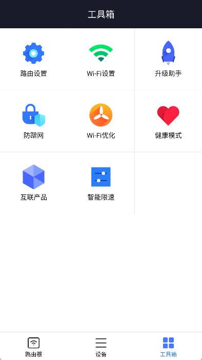4、功能管理:在的工具箱中可以进行防蹭网设置、测试网速、WiFi优化、恢复出厂设置等操作;还支持远程管理功能,即使手机不在路由器的WiFi信号范围内,也能管理路由器。
