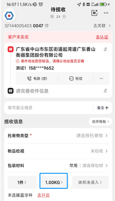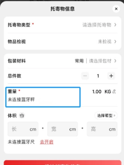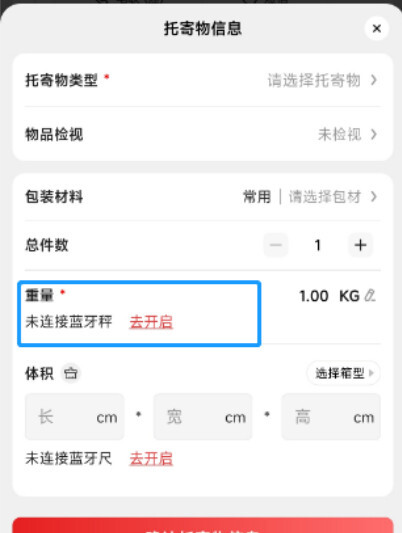 揽收任务创建完成后,界面显示如下,点击图中标注的“1.00kg”区域,即可进入寄托物信息页面。接着点击“去开启”按钮,开启蓝牙功能,为连接电子秤做好准备。